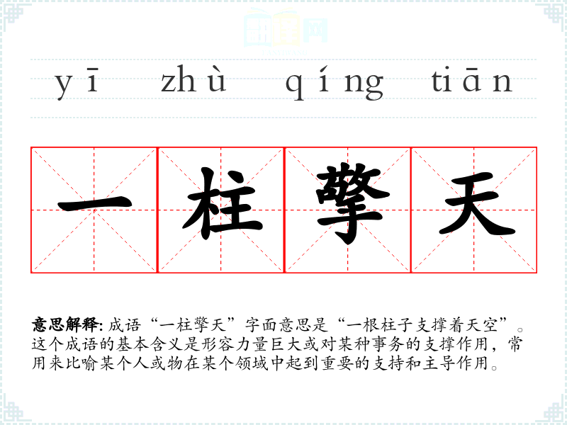 成语“一柱擎天”字面意思是“一根柱子支撑着天空”。这个成语的基本含义是形容力量巨大或对某种事务的支撑作用,常用来比喻某个人或物在某个领域中起到重要的支持和主导作用。