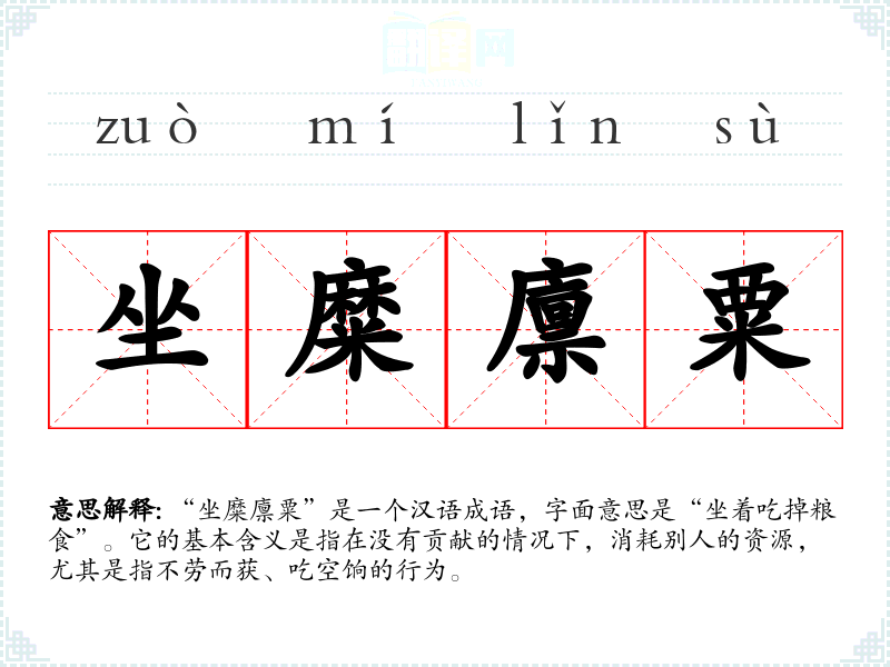 “坐糜廪粟”是一个汉语成语,字面意思是“坐着吃掉粮食”。它的基本含义是指在没有贡献的情况下,消耗别人的资源,尤其是指不劳而获、吃空饷的行为。