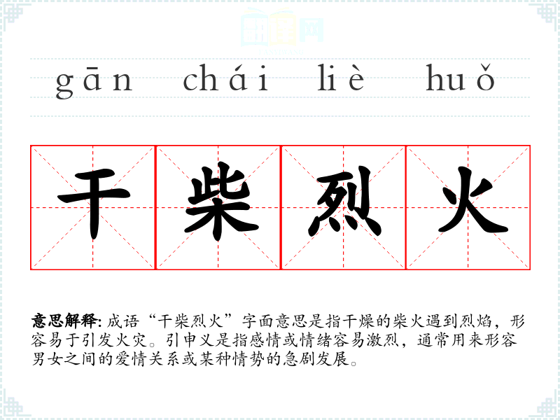 成语“干柴烈火”字面意思是指干燥的柴火遇到烈焰,形容易于引发火灾。引申义是指感情或情绪容易激烈,通常用来形容男女之间的爱情关系或某种情势的急剧发展。