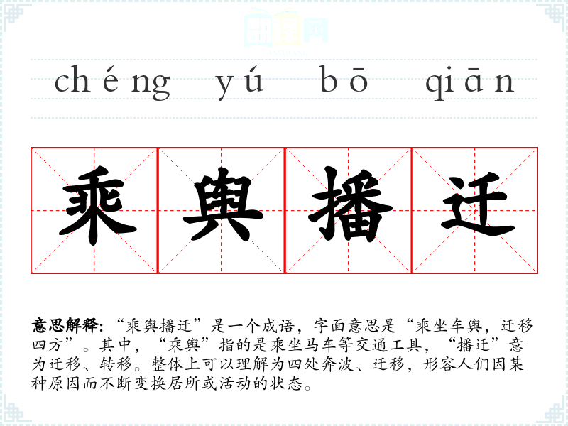 “乘舆播迁”是一个成语,字面意思是“乘坐车舆,迁移四方”。其中,“乘舆”指的是乘坐马车等交通工具,“播迁”意为迁移、转移。整体上可以理解为四处奔波、迁移,形容人们因某种原因而不断变换居所或活动的状态。