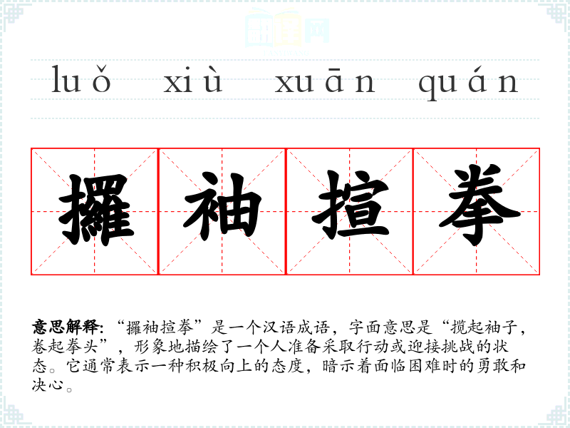 “攞袖揎拳”是一个汉语成语,字面意思是“揽起袖子,卷起拳头”,形象地描绘了一个人准备采取行动或迎接挑战的状态。它通常表示一种积极向上的态度,暗示着面临困难时的勇敢和决心。