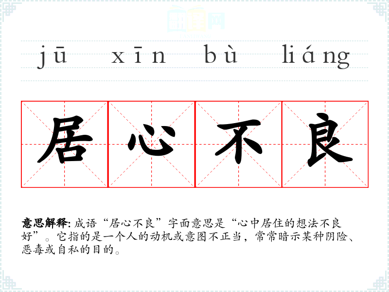 成语“居心不良”字面意思是“心中居住的想法不良好”。它指的是一个人的动机或意图不正当,常常暗示某种阴险、恶毒或自私的目的。