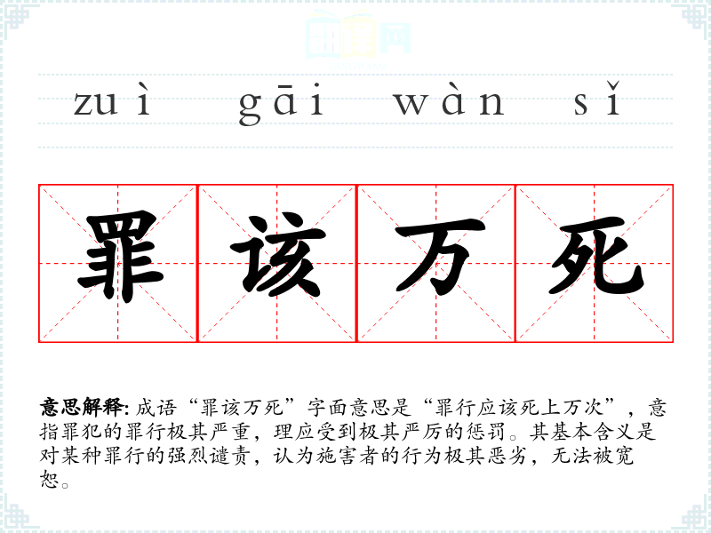 成语“罪该万死”字面意思是“罪行应该死上万次”,意指罪犯的罪行极其严重,理应受到极其严厉的惩罚。其基本含义是对某种罪行的强烈谴责,认为施害者的行为极其恶劣,无法被宽恕。