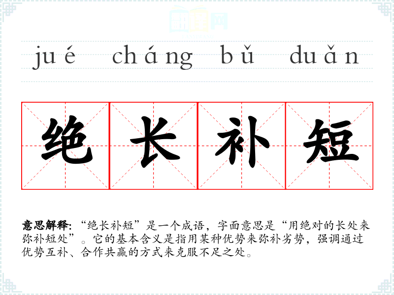 “绝长补短”是一个成语,字面意思是“用绝对的长处来弥补短处”。它的基本含义是指用某种优势来弥补劣势,强调通过优势互补、合作共赢的方式来克服不足之处。
