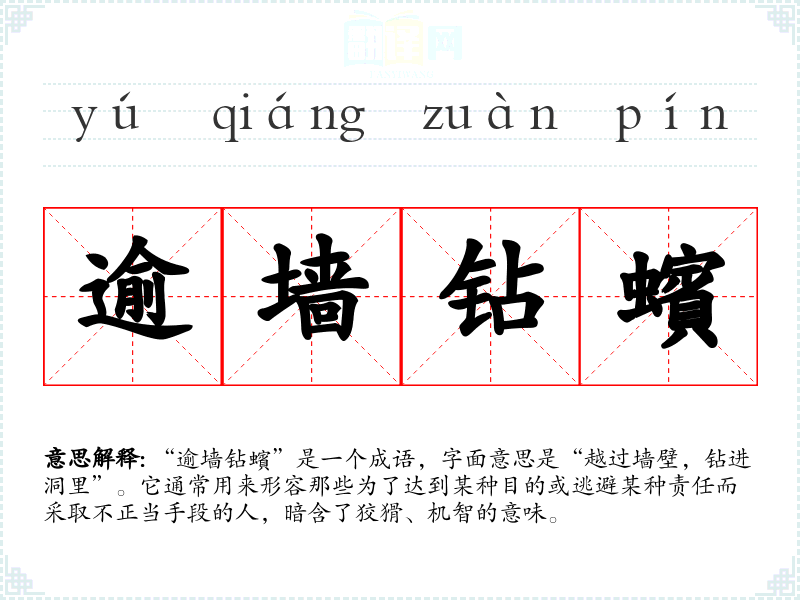“逾墙钻蠙”是一个成语,字面意思是“越过墙壁,钻进洞里”。它通常用来形容那些为了达到某种目的或逃避某种责任而采取不正当手段的人,暗含了狡猾、机智的意味。