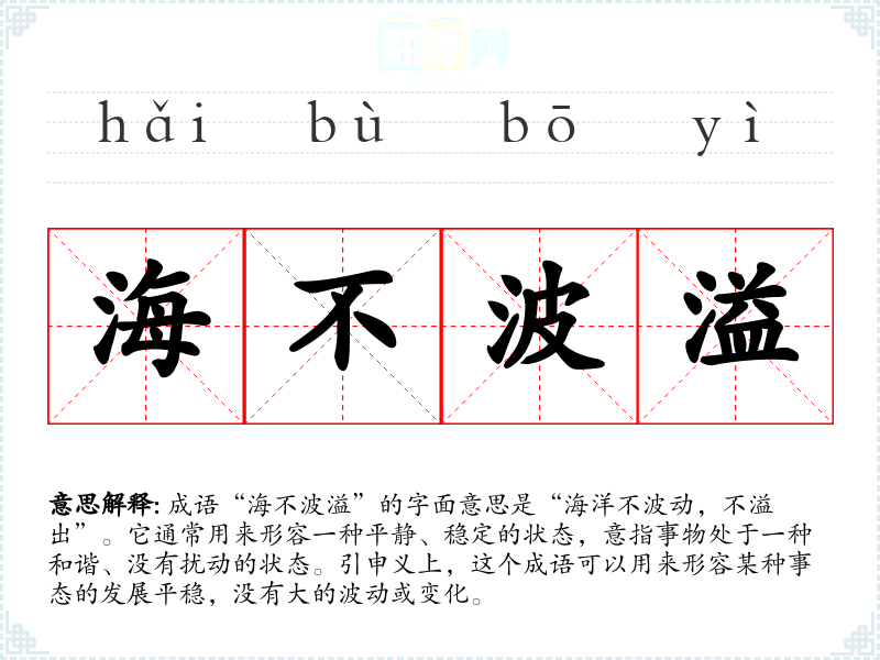 成语“海不波溢”的字面意思是“海洋不波动,不溢出”。它通常用来形容一种平静、稳定的状态,意指事物处于一种和谐、没有扰动的状态。引申义上,这个成语可以用来形容某种事态的发展平稳,没有大的波动或变化。