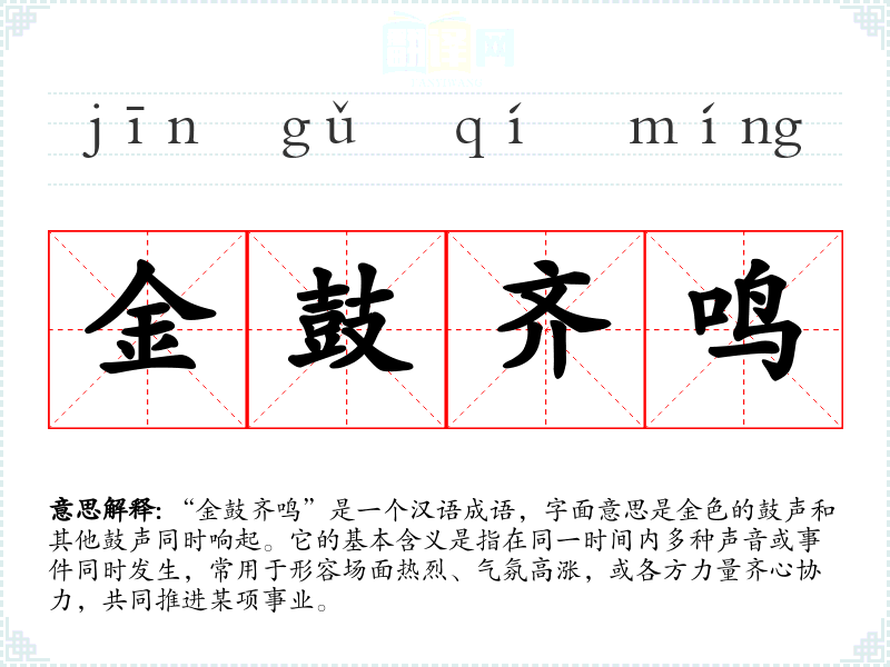 “金鼓齐鸣”是一个汉语成语,字面意思是金色的鼓声和其他鼓声同时响起。它的基本含义是指在同一时间内多种声音或**同时发生,常用于形容场面热烈、气氛高涨,或各方力量齐心协力,共同推进某项事业。