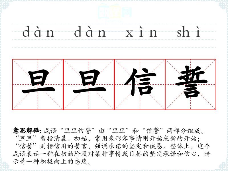 成语“旦旦信誓”由“旦旦”和“信誓”两部分组成。“旦旦”意指清晨、初始,常用来形容事情刚开始或新的开始;“信誓”则指信用的誓言,强调承诺的坚定和诚恳。整体上,这个成语表示一种在初始阶段对某种事情或目标的坚定承诺和信心,暗示着一种积极向上的态度。