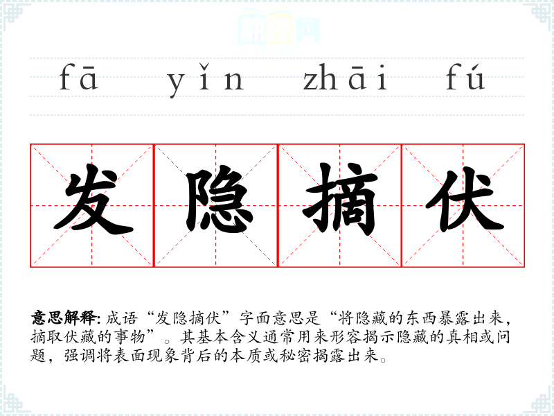 成语“发隐摘伏”字面意思是“将隐藏的东西暴露出来,摘取伏藏的事物”。其基本含义通常用来形容揭示隐藏的真相或问题,强调将表面现象背后的本质或秘密揭露出来。