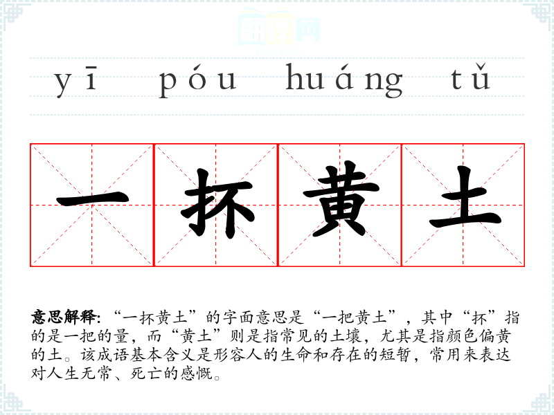 “一抔黄土”的字面意思是“一把黄土”,其中“抔”指的是一把的量,而“黄土”则是指常见的土壤,尤其是指颜色偏黄的土。该成语基本含义是形容人的生命和存在的短暂,常用来表达对人生无常、死亡的感慨。