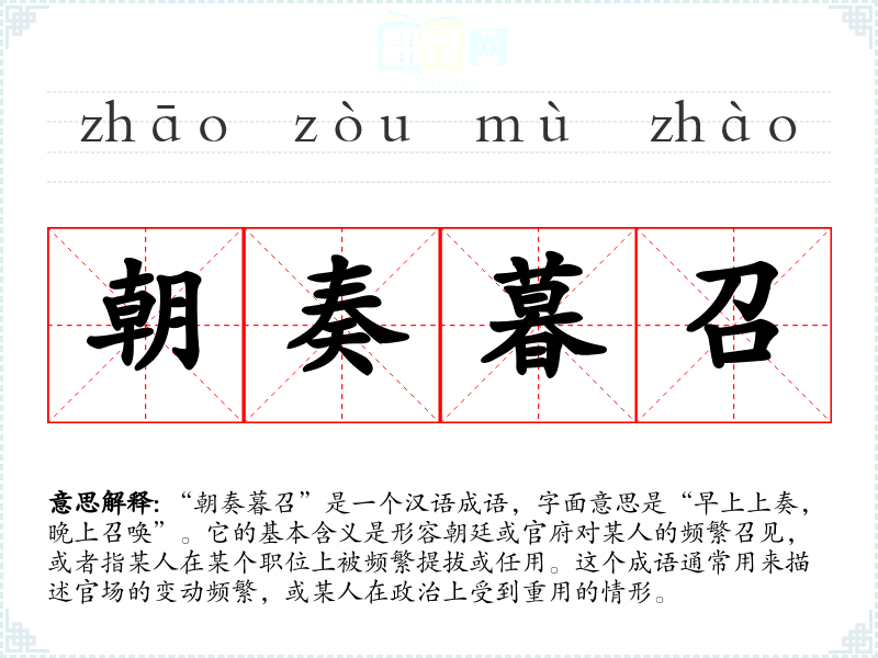 “朝奏暮召”是一个汉语成语,字面意思是“早上上奏,晚上召唤”。它的基本含义是形容朝廷或官府对某人的频繁召见,或者指某人在某个职位上被频繁提拔或任用。这个成语通常用来描述官场的变动频繁,或某人在政治上受到重用的情形。
