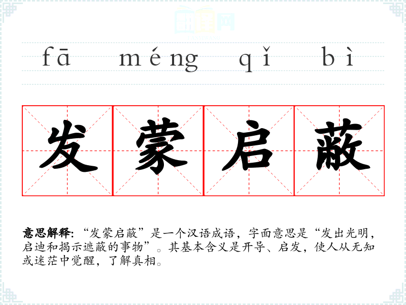 “发蒙启蔽”是一个汉语成语,字面意思是“发出光明,启迪和揭示遮蔽的事物”。其基本含义是开导、启发,使人从无知或迷茫中觉醒,了解真相。
