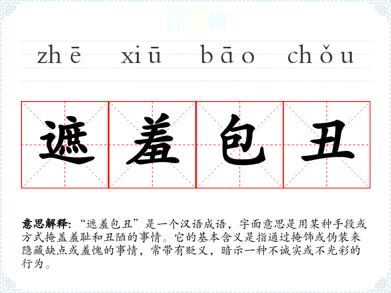 “遮羞包丑”是一个汉语成语,字面意思是用某种手段或方式掩盖羞耻和丑陋的事情。它的基本含义是指通过掩饰或伪装来隐藏缺点或羞愧的事情,常带有贬义,暗示一种不诚实或不光彩的行为。