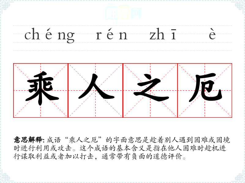 成语“乘人之厄”的字面意思是趁着别人遇到困难或困境时进行利用或攻击。这个成语的基本含义是指在他人困难时趁机进行谋取利益或者加以打击,通常带有负面的道德评价。