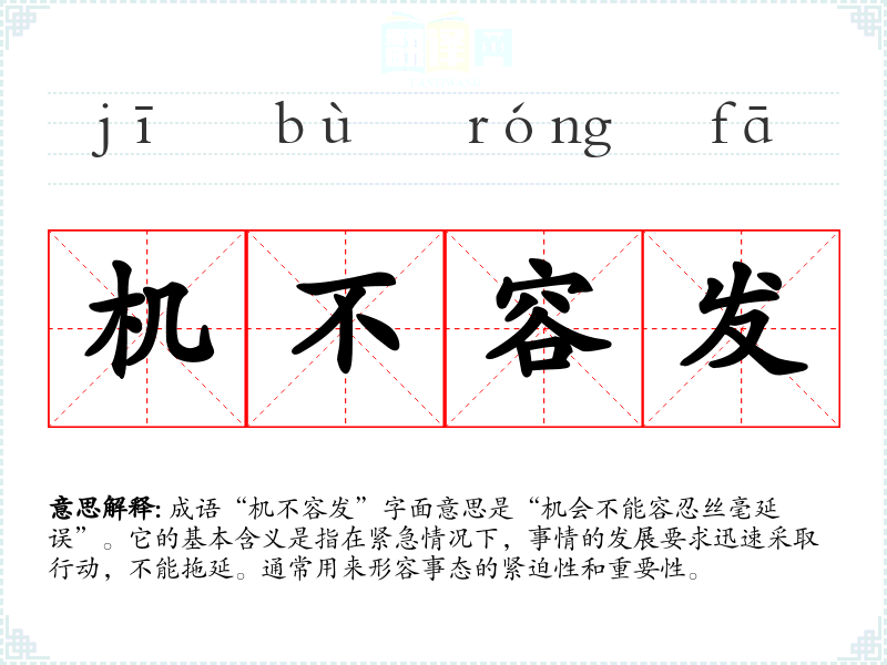 成语“机不容发”字面意思是“机会不能容忍丝毫延误”。它的基本含义是指在紧急情况下,事情的发展要求迅速采取行动,不能拖延。通常用来形容事态的紧迫性和重要性。