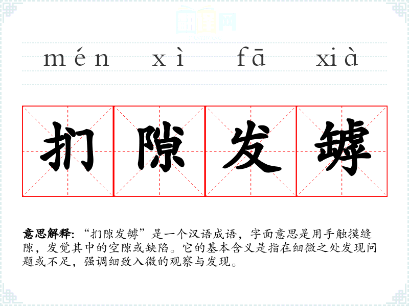 “扪隙发罅”是一个汉语成语,字面意思是用手触摸缝隙,发觉其中的空隙或缺陷。它的基本含义是指在细微之处发现问题或不足,强调细致入微的观察与发现。