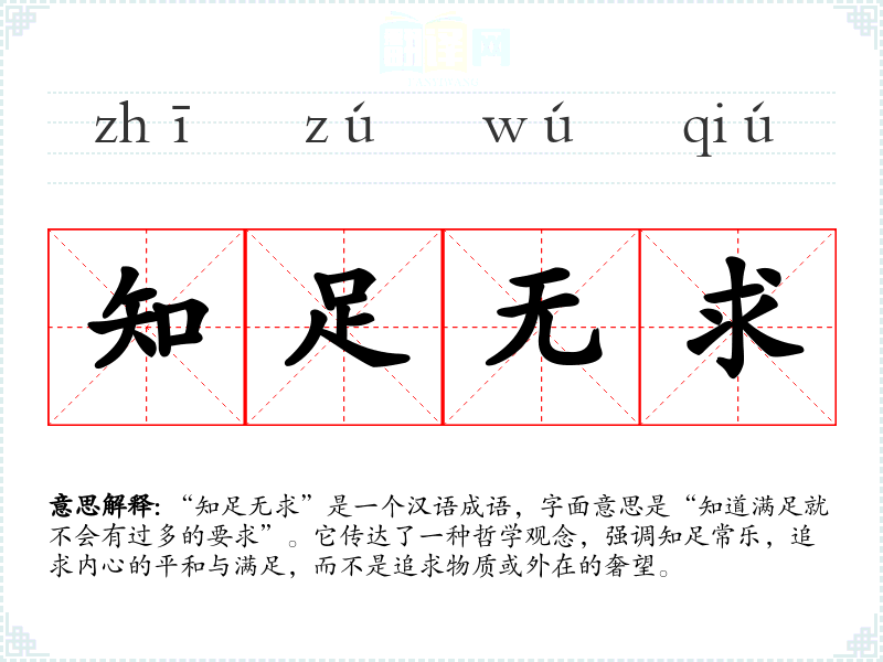 “知足无求”是一个汉语成语,字面意思是“知道满足就不会有过多的要求”。它传达了一种哲学观念,强调知足常乐,追求内心的平和与满足,而不是追求物质或外在的奢望。