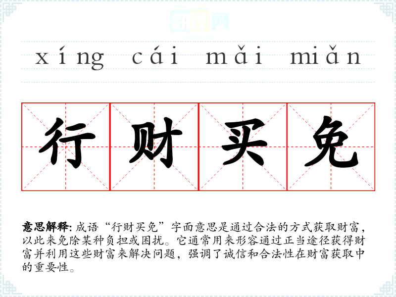 成语“行财买免”字面意思是通过合法的方式获取财富,以此来免除某种负担或困扰。它通常用来形容通过正当途径获得财富并利用这些财富来解决问题,强调了诚信和合法性在财富获取中的重要性。