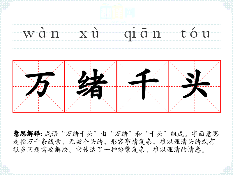 成语“万绪千头”由“万绪”和“千头”组成。字面意思是指万千条线索、无数个头绪,形容事情复杂,难以理清头绪或有很多问题需要解决。它传达了一种纷繁复杂、难以理清的情感。