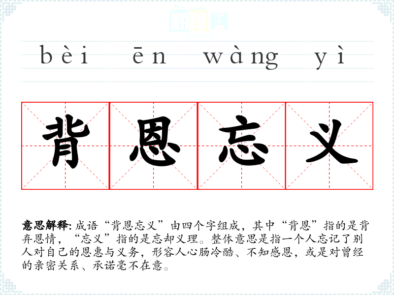 “背恩忘义”这一成语的历史背景较为广泛,最早可以追溯到古代文献中对人际关系和道德伦理的探讨。它的具体来源并不明确,但在**古代文学中,类似的道德观念常常出现在诸子百家、历史记载和古典小说中,用以表现对忘恩负义行为的谴责。