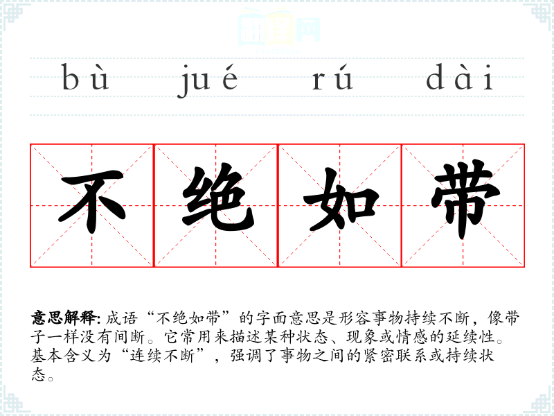成语“不绝如带”的字面意思是形容事物持续不断,像带子一样没有间断。它常用来描述某种状态、现象或情感的延续性。基本含义为“连续不断”,强调了事物之间的紧密联系或持续状态。