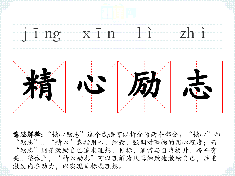 “精心励志”并没有明确的历史典故或文学出处,其构成的词汇在现代汉语中较为常见。这个成语可以看作是对现代社会中个人自我激励和成长需求的反映,特别是在竞争激烈的环境中,强调个体的努力和决心。