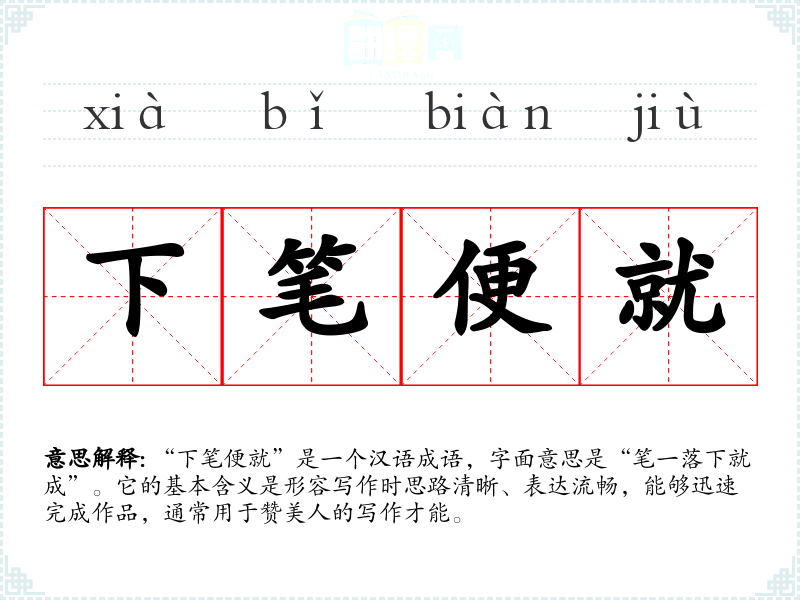 “下笔便就”是一个汉语成语,字面意思是“笔一落下就成”。它的基本含义是形容写作时思路清晰、表达流畅,能够迅速完成作品,通常用于赞美人的写作才能。