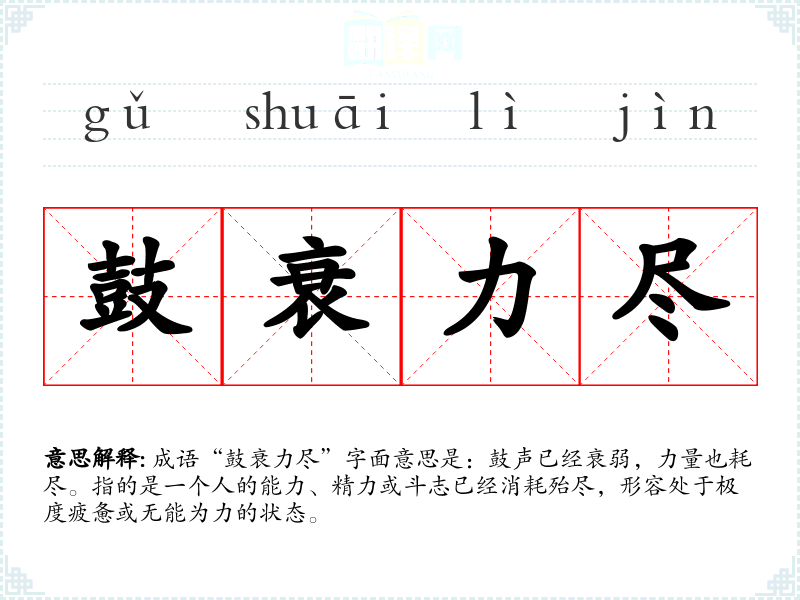 成语“鼓衰力尽”字面意思是:鼓声已经衰弱,力量也耗尽。指的是一个人的能力、精力或斗志已经消耗殆尽,形容处于极度疲惫或无能为力的状态。