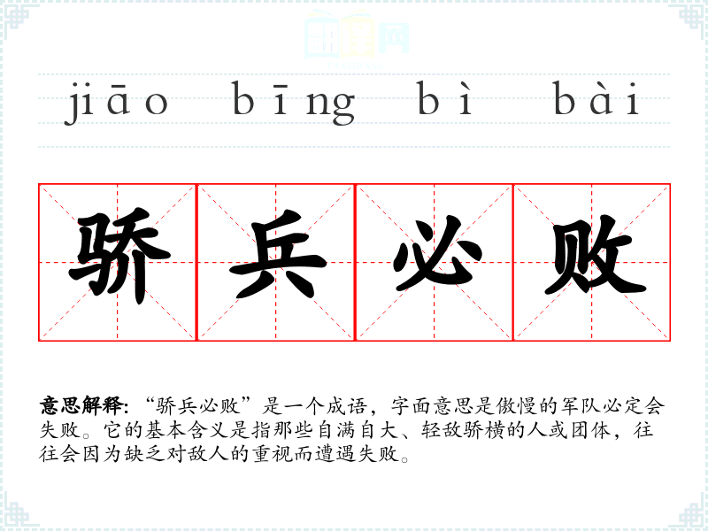 “骄兵必败”是一个成语,字面意思是傲慢的军队必定会失败。它的基本含义是指那些自满自大、轻敌骄横的人或团体,往往会因为缺乏对敌人的重视而遭遇失败。