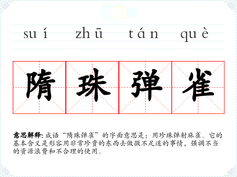 成语“隋珠弹雀”的字面意思是:用珍珠弹射麻雀。它的基本含义是形容用非常珍贵的东西去做微不足道的事情,强调不当的资源浪费和不合理的使用。