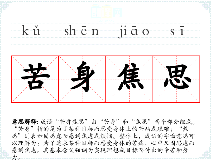 成语“苦身焦思”由“苦身”和“焦思”两个部分组成。“苦身”指的是为了某种目标而忍受身体上的苦痛或艰难;“焦思”则表示因思虑而感到焦虑或烦恼。整体上,成语的字面意思可以理解为:为了追求某种目标而忍受身体的苦痛,心中又因思虑而感到焦虑。其基本含义强调为实现理想或目标而付出的辛苦和努力。