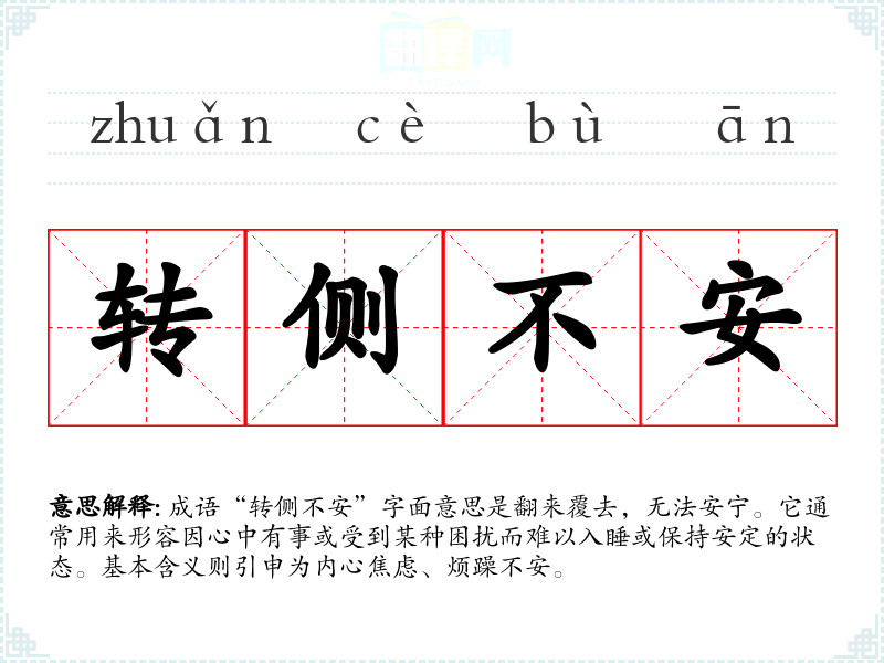 成语“转侧不安”字面意思是翻来覆去,无法安宁。它通常用来形容因心中有事或受到某种困扰而难以入睡或保持安定的状态。基本含义则引申为内心焦虑、烦躁不安。