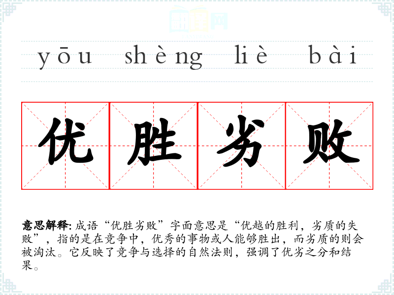 成语“优胜劣败”字面意思是“优越的胜利,劣质的失败”,指的是在竞争中,优秀的事物或人能够胜出,而劣质的则会被淘汰。它反映了竞争与选择的自然法则,强调了优劣之分和结果。