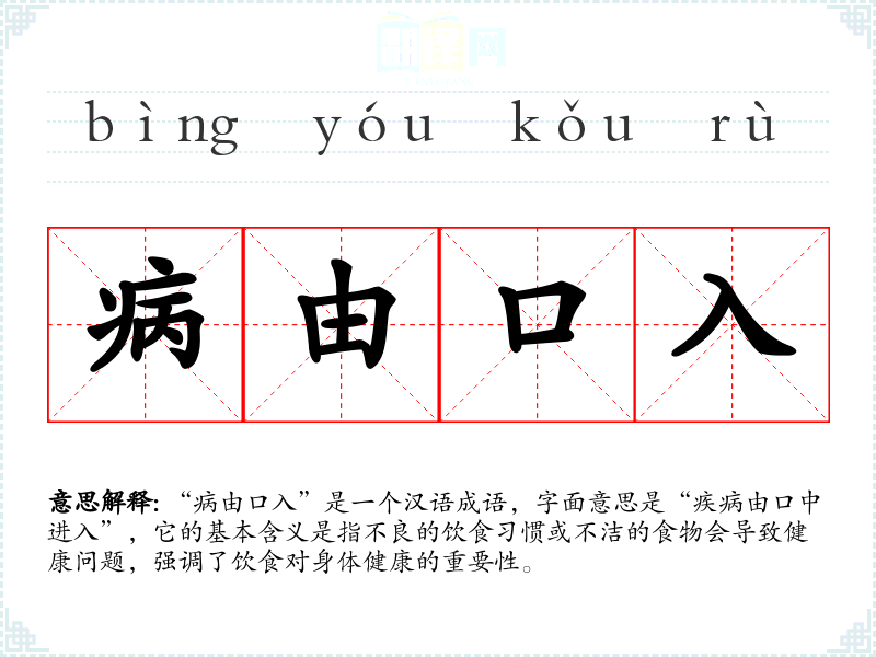 “病由口入”是一个汉语成语,字面意思是“疾病由口中进入”,它的基本含义是指不良的饮食*惯或不洁的食物会导致健康问题,强调了饮食对身体健康的重要性。