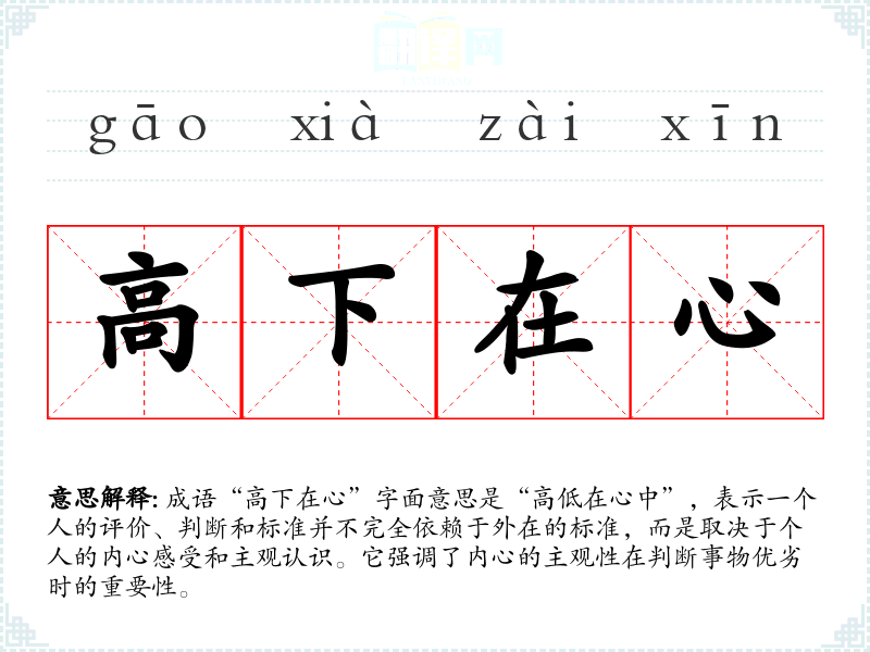 成语“高下在心”字面意思是“高低在心中”,表示一个人的评价、判断和标准并不完全依赖于外在的标准,而是取决于个人的内心感受和主观认识。它强调了内心的主观性在判断事物优劣时的重要性。