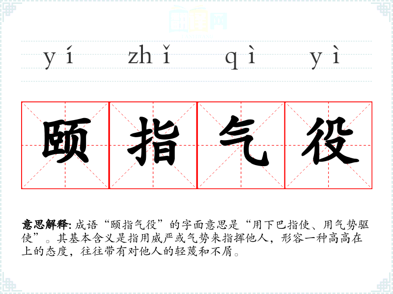 成语“颐指气役”的字面意思是“用下巴指使、用气势驱使”。其基本含义是指用威严或气势来指挥他人,形容一种高高在上的态度,往往带有对他人的轻蔑和不屑。