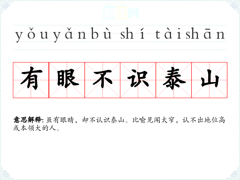 | 不识泰山 | 不认识泰山。比喻见闻太窄,认不出地位高或本领大的人。 |