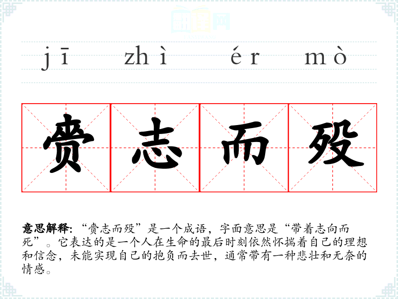 | 赍志而没 | 赍:怀抱着,带着;殁:死。志愿没有实现就死了。 |