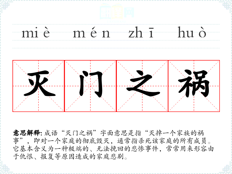 成语“灭门之祸”字面意思是指“灭掉一个家族的祸事”,即对一个家庭的彻底毁灭,通常指杀死该家庭的所有成员。它基本含义为一种极端的、无法挽回的悲惨**,常常用来形容由于仇恨、报复等原因造成的家庭悲剧。