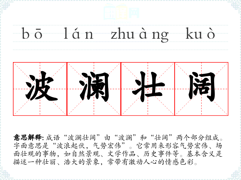 | 波澜壮阔 | 原形容水面辽阔。现比喻声势雄壮或规模巨大。 |