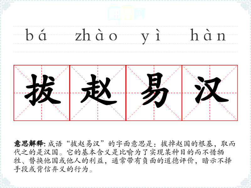 成语“拔赵易汉”的字面意思是:拔掉赵国的根基,取而代之的是汉国。它的基本含义是比喻为了实现某种目的而不惜牺牲、替换他国或他人的利益,通常带有负面的道德评价,暗示不择手段或背信弃义的行为。