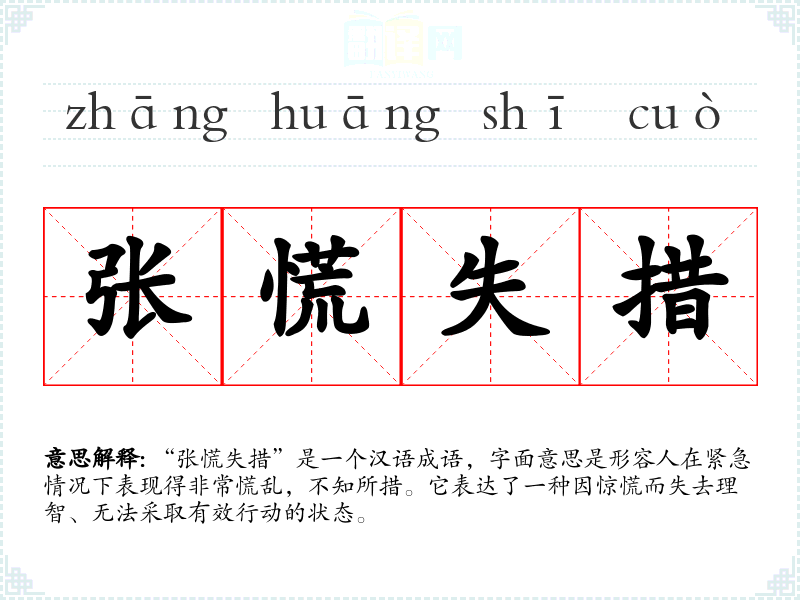 “张慌失措”是一个汉语成语,字面意思是形容人在紧急情况下表现得非常慌乱,不知所措。它表达了一种因惊慌而失去理智、无法采取有效行动的状态。