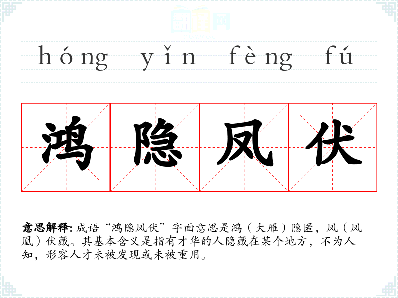 成语“鸿隐凤伏”字面意思是鸿(大雁)隐匿,凤(凤凰)伏藏。其基本含义是指有才华的人隐藏在某个地方,不为人知,形容人才未被发现或未被重用。