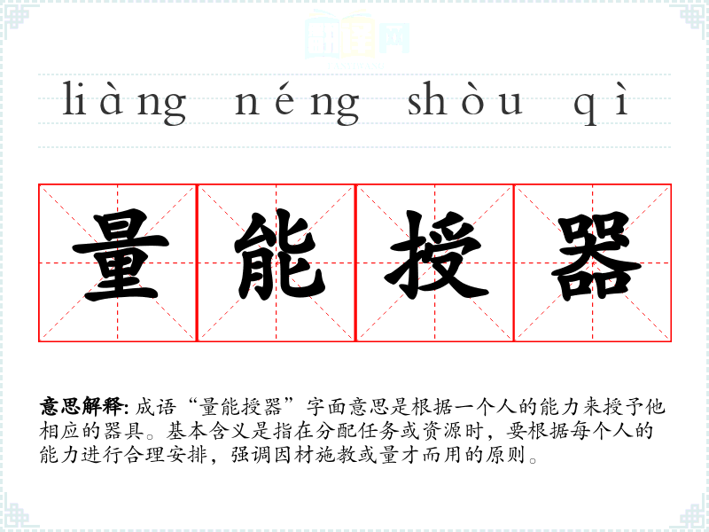 “量能授器”源于古代对人才使用的观点,强调对人的能力进行评估后再进行合理的分配和安排。这一成语虽然没有明确的历史典故,但可以看作是对古代儒家思想的延续,儒家强调的“因材施教”与“量才而用”正是与此成语的内涵相契合。