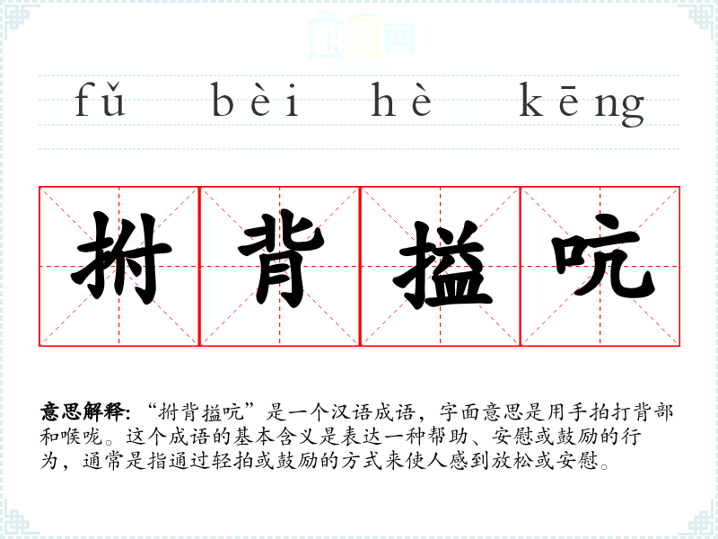 “拊背搤吭”是一个汉语成语,字面意思是用手拍打背部和喉咙。这个成语的基本含义是表达一种帮助、安慰或鼓励的行为,通常是指通过轻拍或鼓励的方式来使人感到放松或安慰。