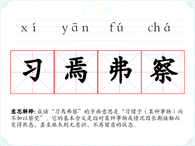 成语“习焉弗察”的字面意思是“习惯于(某种事物)而不加以察觉”。它的基本含义是指对某种事物或情况因长期接触而变得熟悉,甚至麻木到无意识、不再留意的状态。