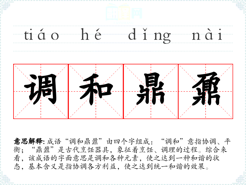 成语“调和鼎鼐”由四个字组成:“调和”意指协调、平衡;“鼎鼐”是古代烹饪器具,象征着烹饪、调理的过程。综合来看,该成语的字面意思是调和各种元素,使之达到一种和谐的状态,基本含义是指协调各方利益,使之达到统一和谐的效果。