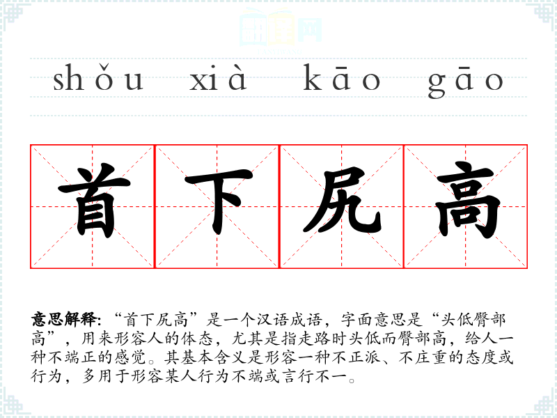 “首下尻高”是一个汉语成语,字面意思是“头低臀部高”,用来形容人的体态,尤其是指走路时头低而臀部高,给人一种不端正的感觉。其基本含义是形容一种不正派、不庄重的态度或行为,多用于形容某人行为不端或言行不一。