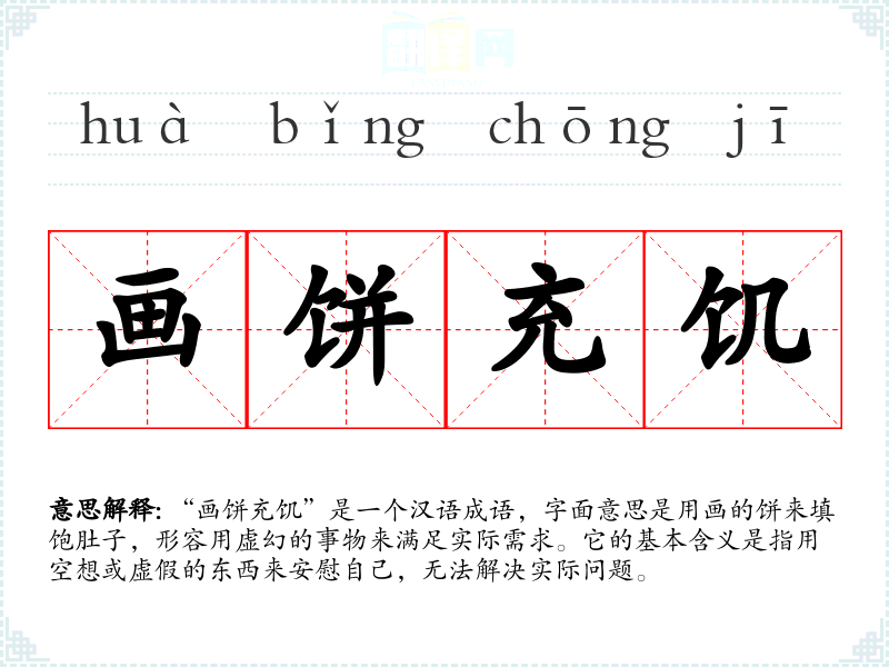 | 充饥画饼 | 画个饼子来解饿。比喻虚有其名而无补于实际。也比喻用空想来安慰自己。 |