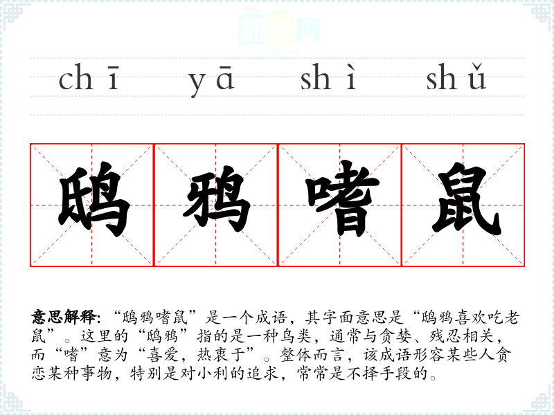 “鸱鸦嗜鼠”是一个成语,其字面意思是“鸱鸦喜欢吃老鼠”。这里的“鸱鸦”指的是一种鸟类,通常与贪婪、残忍相关,而“嗜”意为“喜爱,热衷于”。整体而言,该成语形容某些人贪恋某种事物,特别是对小利的追求,常常是不择手段的。